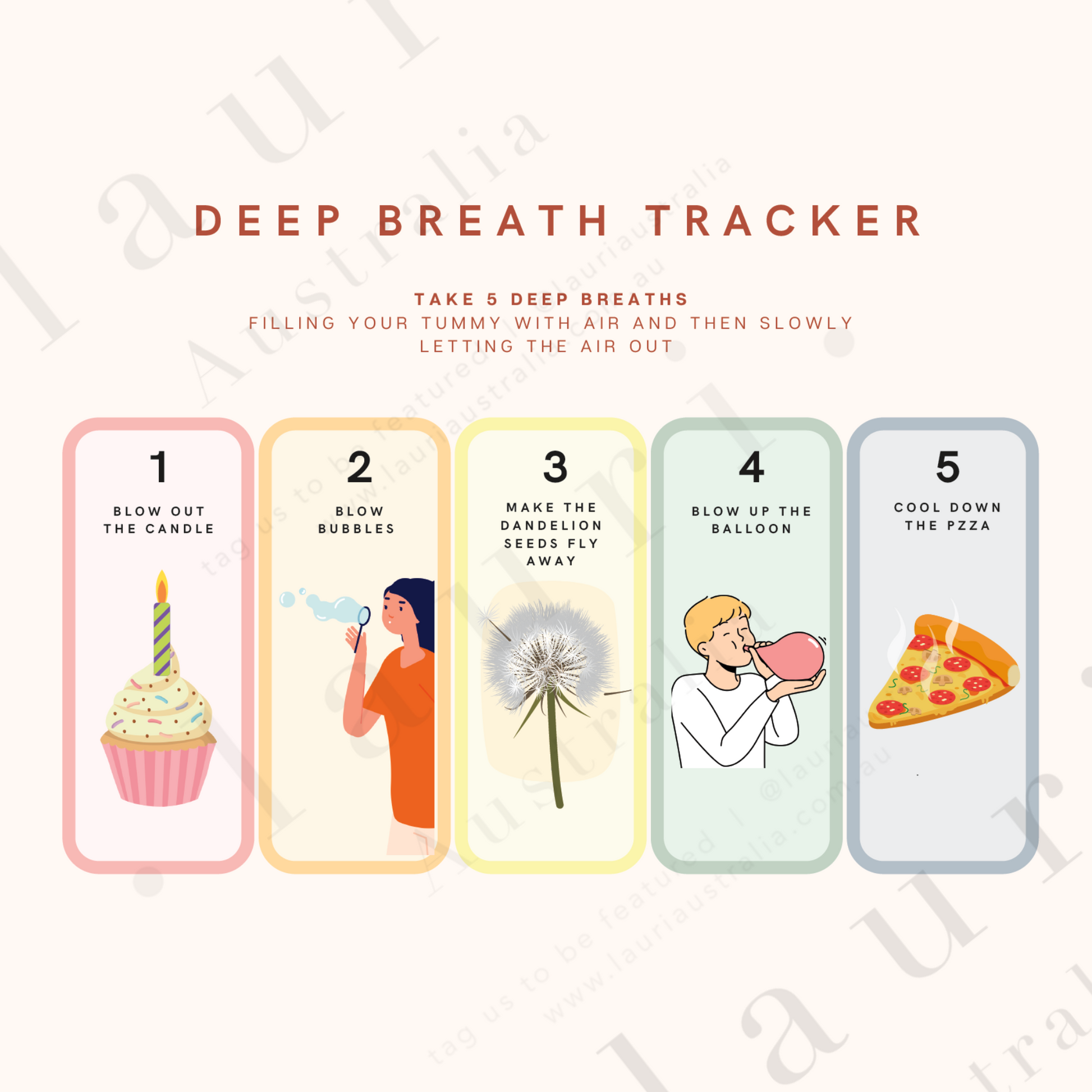 For best use of this pack we recommend printing the document double sided, laminating the sheet, foldng up the flaps and attaching small Velcro dots. Watch our instructional video for a detailed guide on making the deep breath tracker for your child.