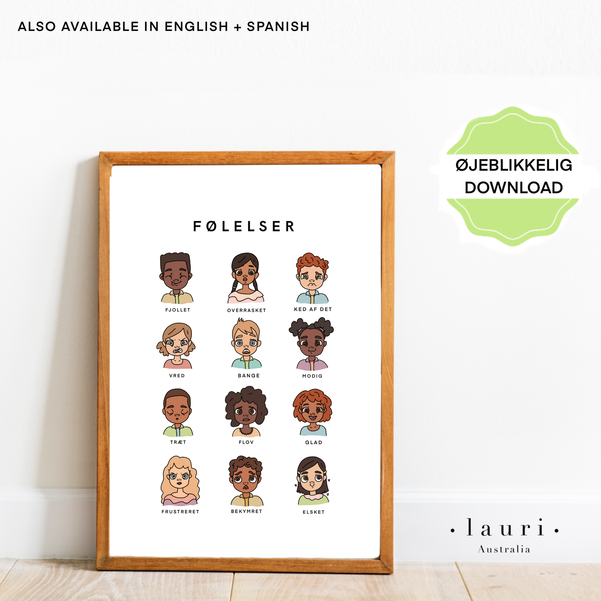 Danish Poster - Kopi af Feelings Plakat til Child's Calming Corner DIGITAL DOWNLOAD Udskriv