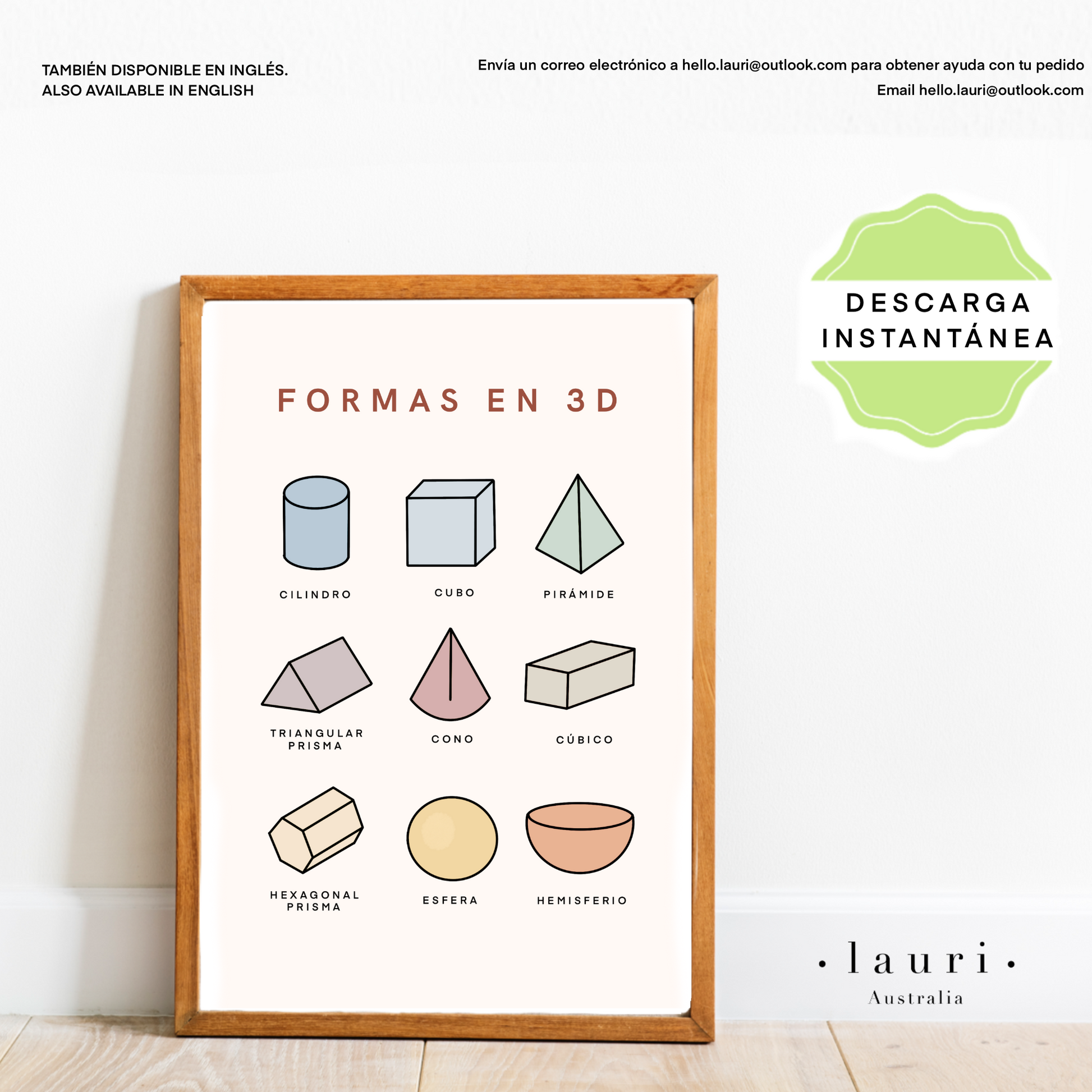 Esta es una descarga digital de un póster educativo que muestra formas 3D en una encantadora paleta de colores del arcoíris, bohemio y apagado. Adecuado para cualquier espacio donde los niños pasen tiempo, ya sea en casa o en el aula.