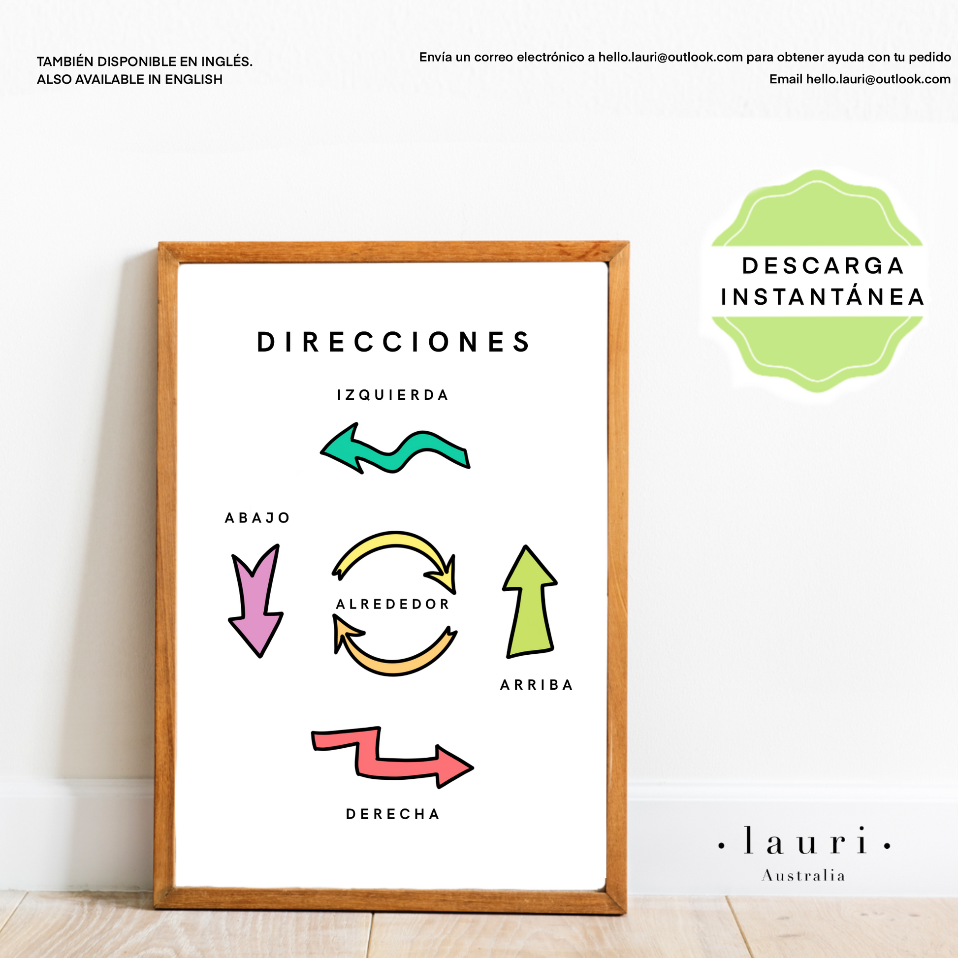 Esta es una descarga digital de un cartel educativo que muestra 5 direcciones en una hermosa paleta de colores de arcoíris brillante. Esta impresión es el arte de pared perfecto para decorar la habitación de tu hijo, guardería o aula de educación en el hogar. Adecuado para cualquier espacio donde los niños pasen tiempo, ya sea en casa o en el aula.