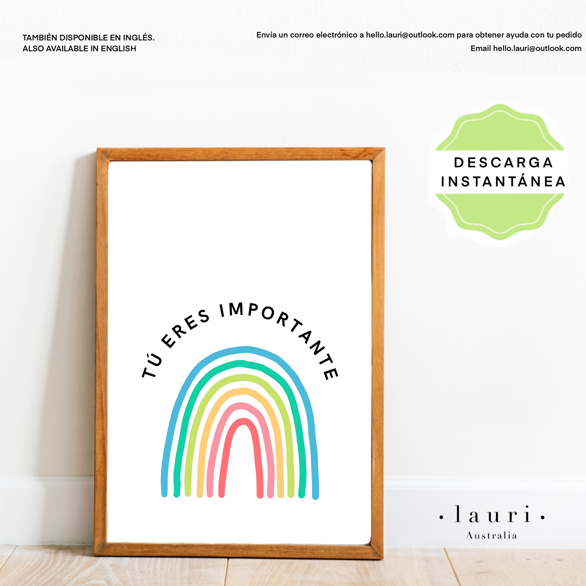 Spanish Rainbow "You are Important" Poster - Póster español "Arcoíris "Eres importante" para el Rincón de Calma de los Niños - Autorregulación DESCARGA DIGITAL - Brillante